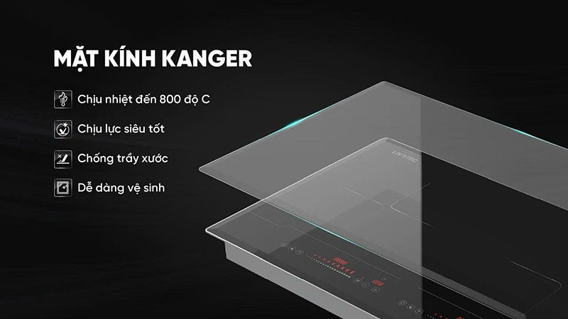 Bếp từ đôi Livotec LID-888 sử dụng mặt kính Eduraz Ceramic cao cấp – loại kính chuyên dụng chịu nhiệt lên đến 800°C và chống va đập tốt.