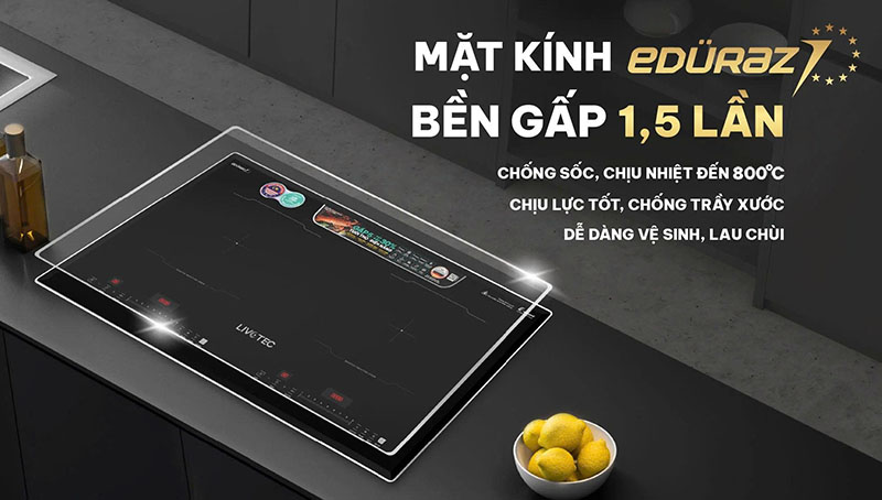 Bếp từ đôi Livotec LID-990M sở hữu mặt kính Eduraz cao cấp có khả năng chịu lực, chịu nhiệt lên tới 800°C, chống trầy xước và dễ dàng lau chùi. Thiết kế bo viền sang trọng, tinh tế, phù hợp mọi không gian bếp hiện đại.