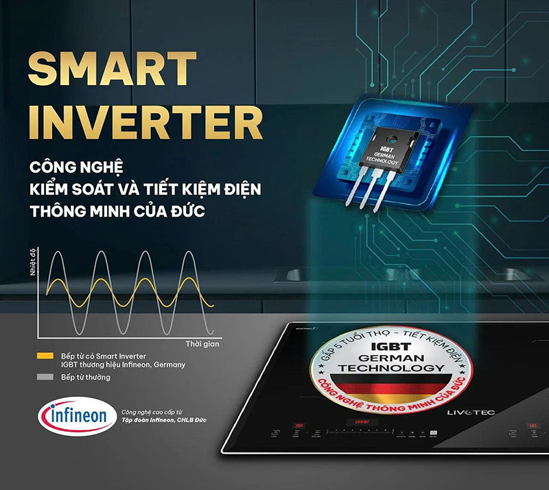 Bếp ứng dụng IGBT cao cấp Infineon – bộ điều khiển dòng điện có khả năng chuyển mạch cực nhanh, đảm bảo dòng điện ổn định, giúp tăng hiệu suất đun nấu, đồng thời nâng tuổi thọ bếp gấp 5 lần so với thông thường.