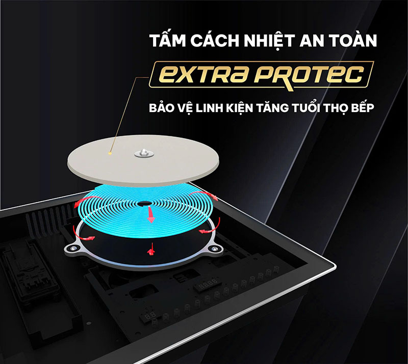 Tấm cách nhiệt Extra Protec giúp cách ly nhiệt hiệu quả giữa vùng nấu và bảng điều khiển, đảm bảo an toàn cho người dùng và tăng tuổi thọ linh kiện.