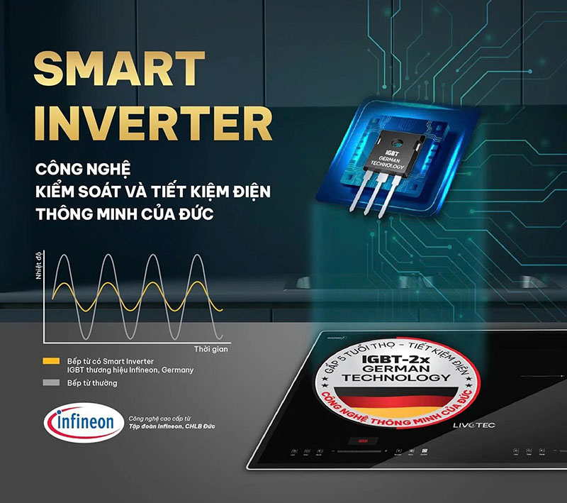 Hệ điều hành IGBT tiêu chuẩn Đức đến từ thương hiệu Infineon giúp kiểm soát dòng điện chính xác, chuyển mạch nhanh, đảm bảo an toàn khi sử dụng và kéo dài tuổi thọ bếp gấp 5 lần.