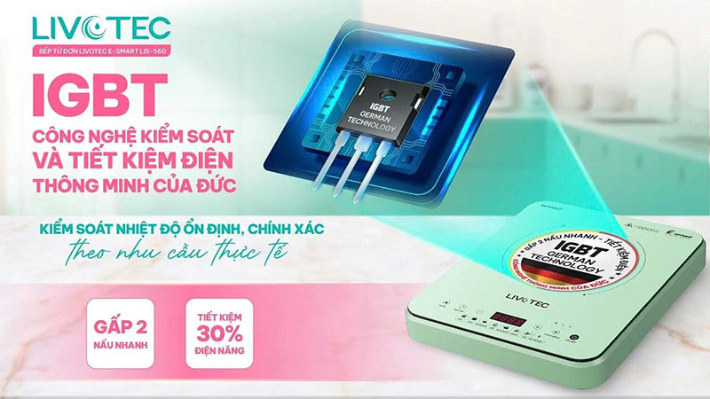 Bếp từ đơn Livotec LIS-560 được trang bị hệ điều hành IGBT cao cấp từ Đức, đóng vai trò như “bộ não” điều khiển toàn bộ hoạt động của bếp. Nhờ khả năng chịu nhiệt tốt, chuyển mạch nhanh và kiểm soát nhiệt độ chính xác, IGBT giúp bếp vận hành ổn định trong thời gian dài.