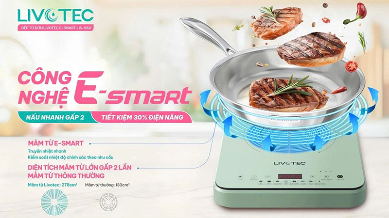 Bếp từ Livotec E-Smart LIS-560 ứng dụng công nghệ E-Smart thông minh, cho phép điều chỉnh nhiệt độ theo nhu cầu thực tế thay vì duy trì công suất tối đa liên tục. Điều này giúp hạn chế lãng phí điện năng và nâng cao hiệu quả nấu nướng.