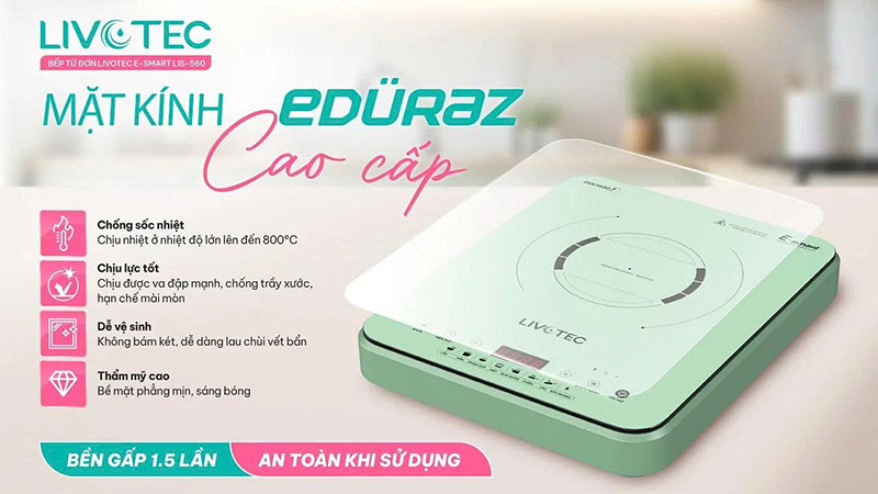 Bếp sử dụng mặt kính EDURAZ nguyên khối cao cấp, có khả năng: