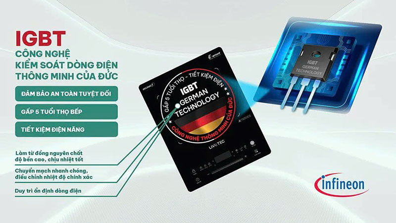 Bếp sử dụng IGBT (Insulated Gate Bipolar Transistor) tiêu chuẩn Đức – linh kiện điều khiển trung tâm giúp kiểm soát dòng điện ổn định, bảo vệ thiết bị khi điện áp dao động.