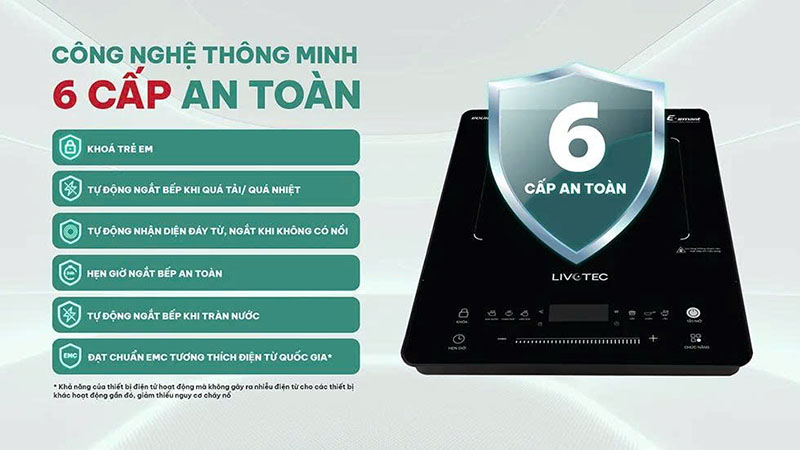 Tính năng an toàn | Ngắt bếp khi không có nồi, Ngắt bếp khi quá nhiệt, Khoá trẻ em, Ngắt khi bếp quá tải, Ngắt bếp khi tràn nước, Hẹn giờ |