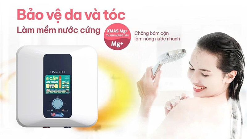 Nguồn nước cứng chứa nhiều khoáng chất có thể gây khô da, xơ tóc và đóng cặn trong thiết bị. Livotec LWH-V20A25 sử dụng thanh Magie XMAS MG+ cỡ lớn, có khả năng: