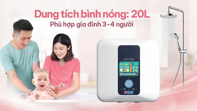 Với dung tích tiêu chuẩn 20 lít, Livotec LWH-V20A25 đáp ứng tốt nhu cầu tắm gội, rửa chén và sinh hoạt hằng ngày cho gia đình nhỏ.