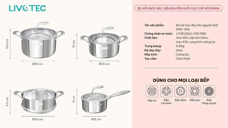 Bộ nồi inox Kochmax KMC-866 mang đến giải pháp nấu nướng thông minh và an toàn cho gian bếp hiện đại. Với chất liệu inox 304 cao cấp đạt tiêu chuẩn LFGB của Đức, kết cấu 3 lớp liền đáy bền chắc, cùng công nghệ đáy Ultra Induction truyền nhiệt nhanh đến 99.9%, sản phẩm không chỉ giúp nấu ăn ngon hơn mà còn tiết kiệm thời gian và năng lượng tối ưu.