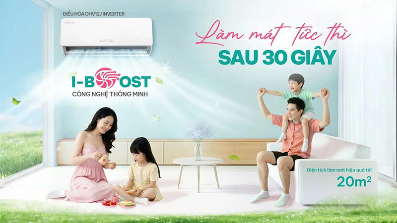 Điểm nổi bật đầu tiên của Livotec DHV12J Inverter là công nghệ i-Boost giúp luồng khí lạnh được thổi ra gần như ngay lập tức sau khi khởi động. Chỉ sau khoảng 30 giây, hơi lạnh đã có thể cảm nhận rõ tại cửa gió.
