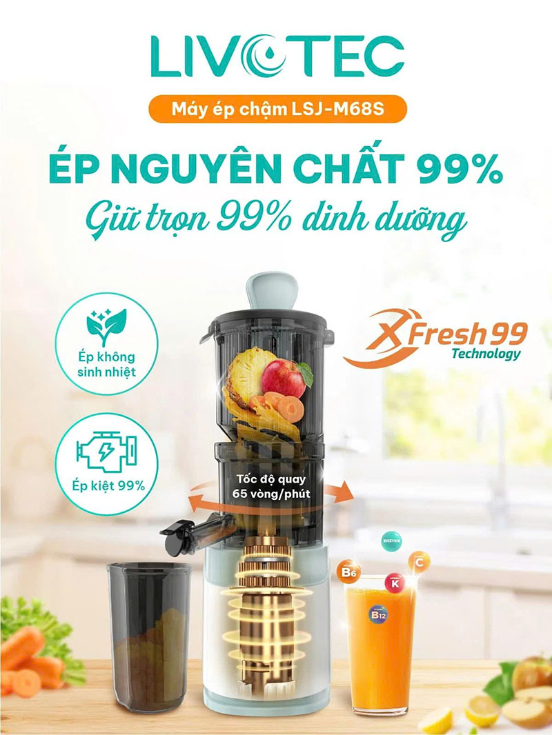 Công nghệ ép lạnh XFresh99 cho phép Livotec LSJ-M68S hoạt động ở tốc độ quay 65 vòng/phút, hạn chế sinh nhiệt và giảm thiểu quá trình oxy hóa.