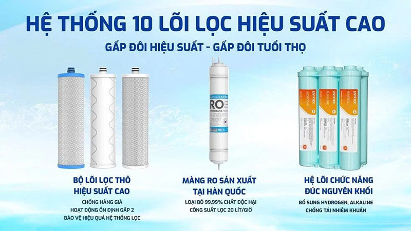 | Hệ thống lọc | Hệ thống lọc 10 lõi hiệu suất cao: cụm lõi lọc thô hiệu suất cao, màng RO và hệ 6 lõi chức năng nguyên khối |
