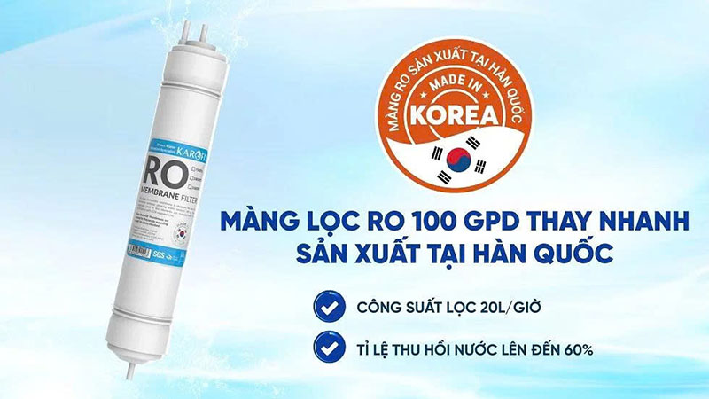 Màng lọc RO nhập khẩu từ Hàn Quốc có thể loại bỏ hầu hết vi khuẩn, virus, asen, ion kim loại nặng và các chất gây hại trong nước.