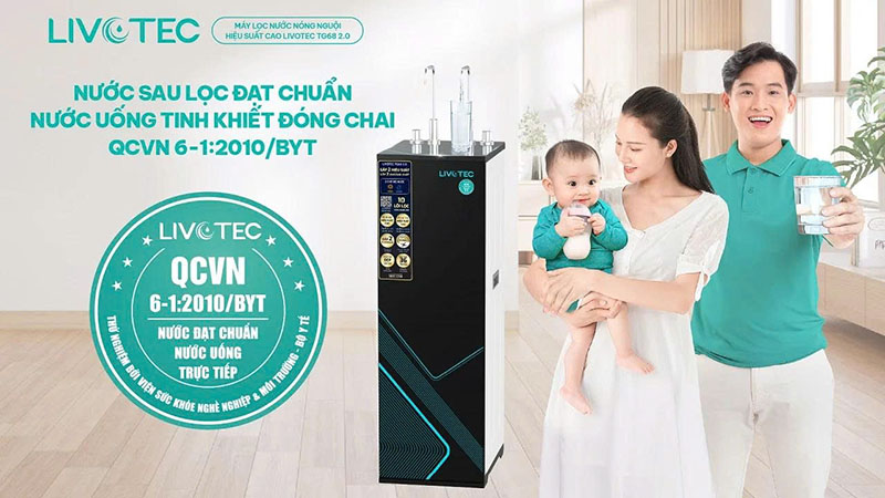Nguồn nước từ máy lọc nước nóng nguội Livotec TG68 2.0 đạt chuẩn QCVN 6-1:2010/BYT, tương đương nước uống đóng chai. Nước đã được kiểm nghiệm bởi đơn vị chuyên môn thuộc Bộ Y tế, đảm bảo: