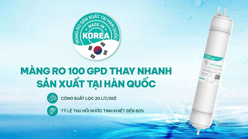 Màng RO 100GPD là trái tim của hệ thống, có khả năng lọc sạch đến 99,99% kim loại nặng, vi khuẩn, vi rút và các ion gây hại khác trong nước. Với công suất lọc 20 lít/giờ và tỉ lệ thu hồi nước tinh khiết lên đến 60%, máy đáp ứng tốt nhu cầu sử dụng nước sạch liên tục cho cả gia đình.