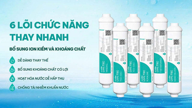 | Các lõi chức năng | Mineral, Alkaline, Farinfrared, T33-GAC (2 lõi), Nano Silver |