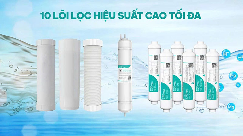 | Hệ thống lọc | Hệ thống lọc 10 lõi lọc công nghệ cao: cụm 3 lõi lọc thô Max Performance, màng RO và 6 lõi chức năng thay nhanh |