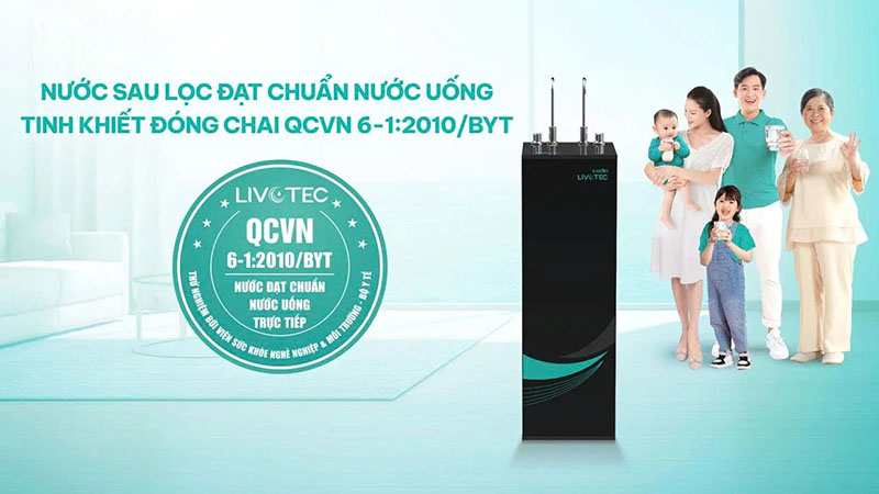 Nước sau lọc từ máy Livotec 608 đạt chuẩn nước uống tinh khiết đóng chai QCVN 6-1:2010/BYT, được Viện Sức khỏe nghề nghiệp & Môi trường thuộc Bộ Y Tế kiểm định và công nhận.