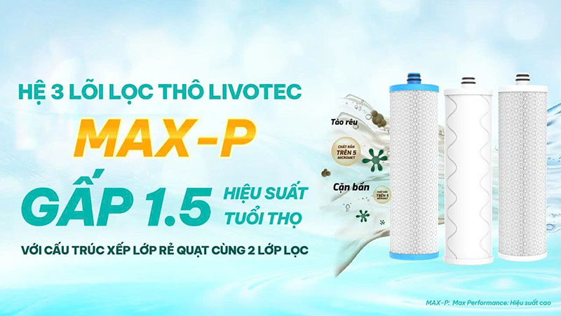 Nhờ khả năng bảo vệ màng RO khỏi tắc nghẽn, hệ lõi Max-P giúp kéo dài tuổi thọ toàn bộ hệ thống lọc, tiết kiệm đáng kể chi phí bảo trì cho người dùng.