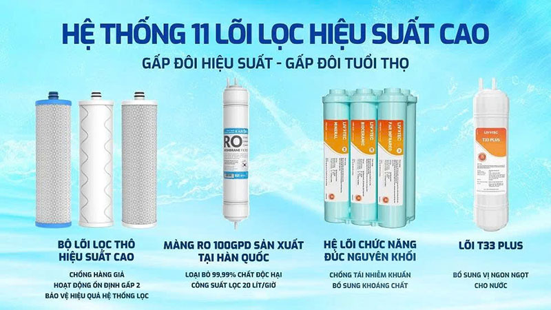 | Hệ thống lọc | Hệ thống lọc 11 lõi hiệu suất cao: cụm lõi lọc thô hiệu suất; màng RO; cụm 6 lõi chức năng nguyên khối và bổ sung thêm 1 lõi T33 Plus |