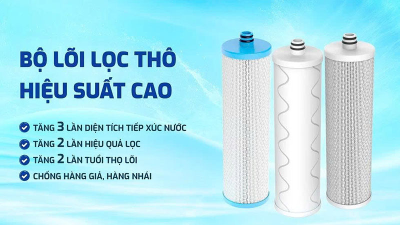 Hệ lõi lọc thô có diện tích tiếp xúc lớn giúp loại bỏ hiệu quả sạn cát, tạp chất hữu cơ, clo dư và các chất lơ lửng siêu nhỏ có kích thước từ 1 micromet. Nhờ cấu trúc 2 lớp chống hàng giả, tuổi thọ lõi tăng gấp đôi – tiết kiệm đến 50% chi phí thay lõi.