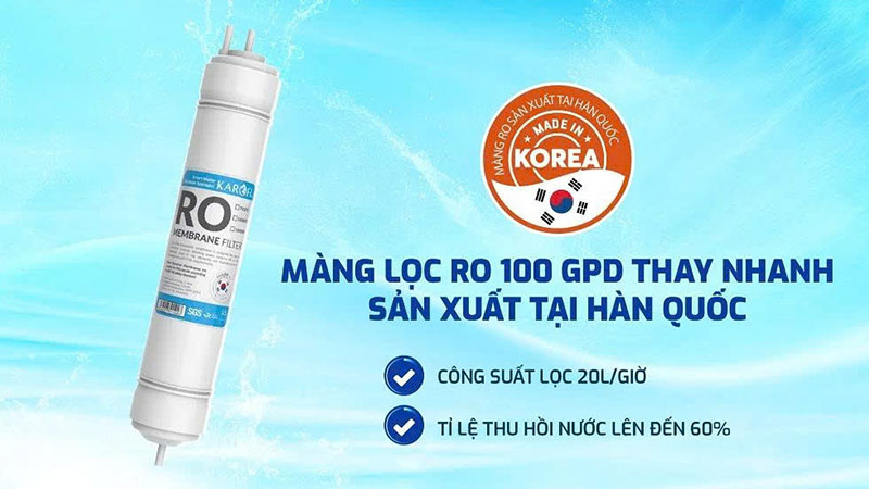 Màng RO thay nhanh, sản xuất tại Hàn Quốc, có khả năng loại bỏ hoàn toàn vi khuẩn, virus, kim loại nặng, hóa chất độc hại. Công suất lọc lên tới 20 lít/giờ đáp ứng nhu cầu sử dụng nước sạch dồi dào cho cả gia đình, cả ngày lẫn đêm.