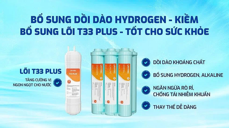 | Các lõi chức năng | Hệ 6 lõi chức năng nguyên khối: Khoáng đá, Alkaline, Tourmaline, Hydrogen, T33-GAC, Nano Silver Plus, T33 Plus |