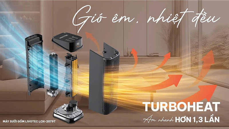 Điểm nổi bật của máy sưởi gốm Livotec LCH-2079T chính là công nghệ TURBOHEAT độc quyền. Máy được trang bị lõi gốm PTC công suất lớn 2000W kết hợp quạt ly tâm và động cơ Dura-Heat chuẩn Class B, giúp tạo ra luồng khí ấm mạnh mẽ và lan tỏa đều.