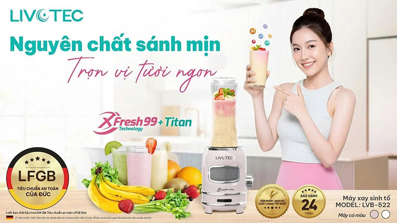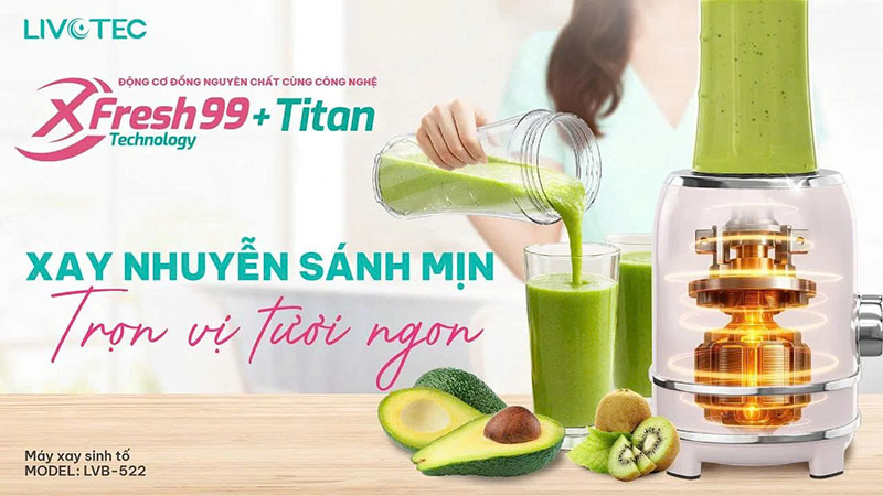 Máy xay sinh tố Livotec LVB-522 ứng dụng công nghệ XFresh99+Titan tiên tiến, giúp hạn chế sinh nhiệt trong quá trình xay. Nhờ đó, vitamin, dưỡng chất và hương vị tự nhiên của nguyên liệu được giữ lại tối đa.