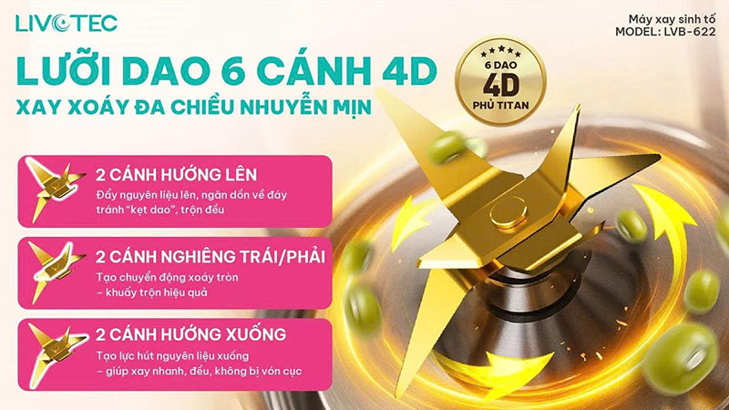 LVB-522 được trang bị lưỡi dao 6 cánh thiết kế 4D, tạo luồng xoáy mạnh mẽ trong quá trình xay. Thiết kế này giúp: