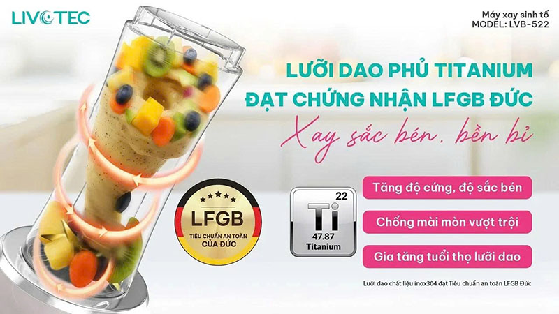 Lưỡi dao của máy xay sinh tố Livotec LVB-522 được chế tác từ inox 304 cao cấp, đạt chứng nhận LFGB của Đức – tiêu chuẩn an toàn thực phẩm hàng đầu châu Âu.