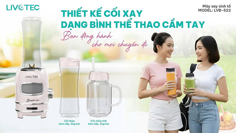 Máy xay sinh tố Livotec LVB-522 được thiết kế cối nhựa dạng bình thể thao, kèm cốc thủy tinh nắp đậy kín, cho phép bạn mang theo sinh tố đến công sở, lớp học, phòng gym hay những chuyến dã ngoại.