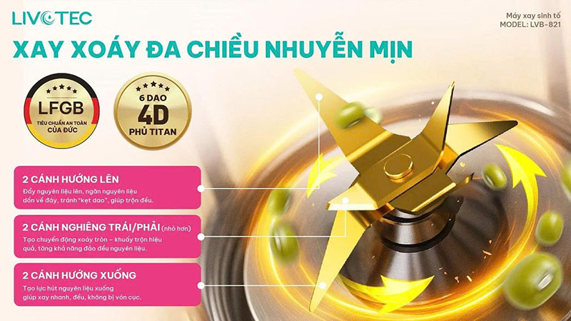 LVB-821 được trang bị lưỡi dao 6 cánh thiết kế 4D, dày 1mm, làm từ inox 304 đạt chứng nhận LFGB của Đức – tiêu chuẩn an toàn thực phẩm hàng đầu châu Âu. Bề mặt lưỡi dao phủ Titanium giúp: