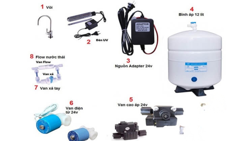 ♦ Nhóm linh kiện điều khiển và áp lực: bơm tăng áp, van điện từ, van áp cao, van áp thấp, flow (cục hạn dòng), bình áp và vòi. Nhóm này quyết định máy chạy, tự ngắt và tự chạy lại.