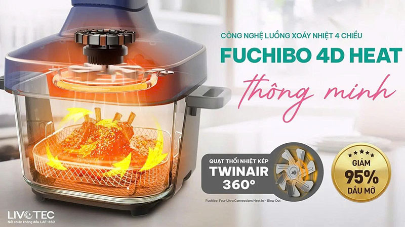 LAF-860 ứng dụng công nghệ độc quyền FUCHIBO, kết hợp quạt thổi TwinAir 360° tạo luồng khí nóng xoáy tròn liên tục trong khoang chiên.