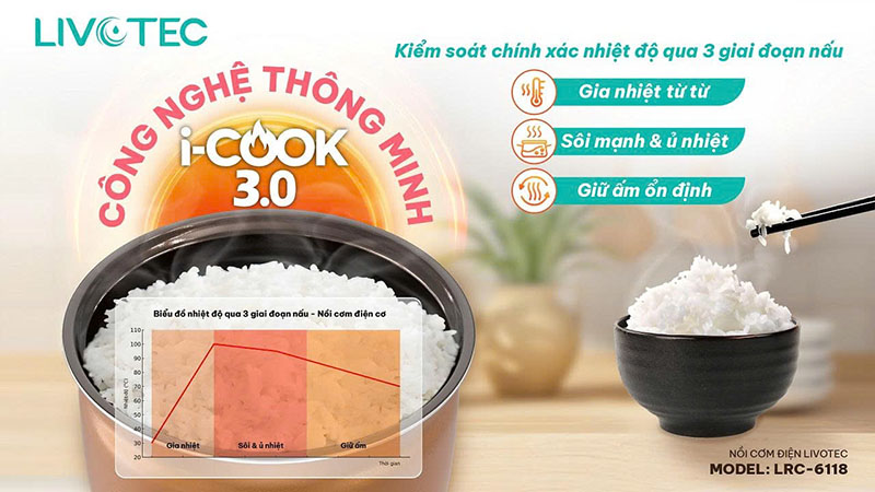Nồi cơm điện Livotec LRC-6118 được trang bị công nghệ iCook 3.0, mô phỏng chính xác cách nấu cơm truyền thống thông qua 3 giai đoạn gia nhiệt: