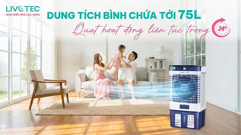 Một trong những điểm nổi bật của quạt điều hòa Livotec LAC-H66S là bình chứa nước dung tích lớn 75 lít.