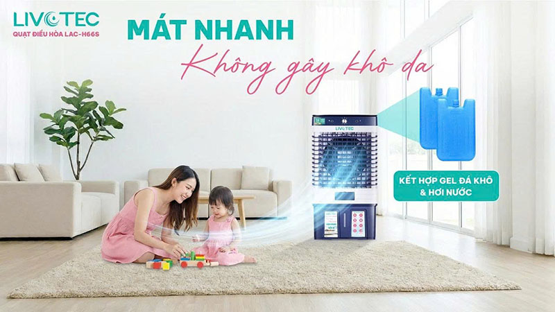 Quạt điều hòa Livotec LAC-H66S sử dụng cơ chế làm mát bằng hơi nước kết hợp gel đá khô, giúp tạo ra luồng gió mát nhanh và dễ chịu.